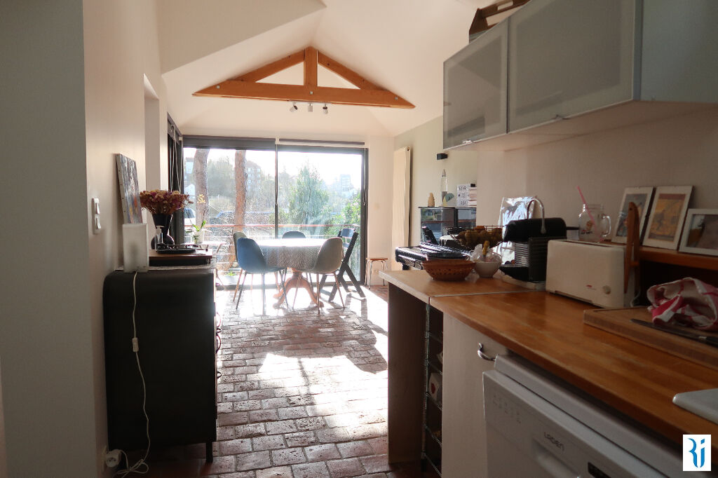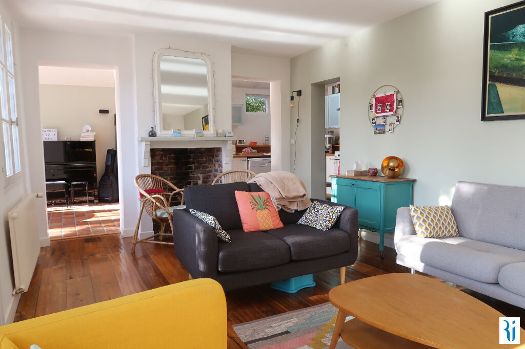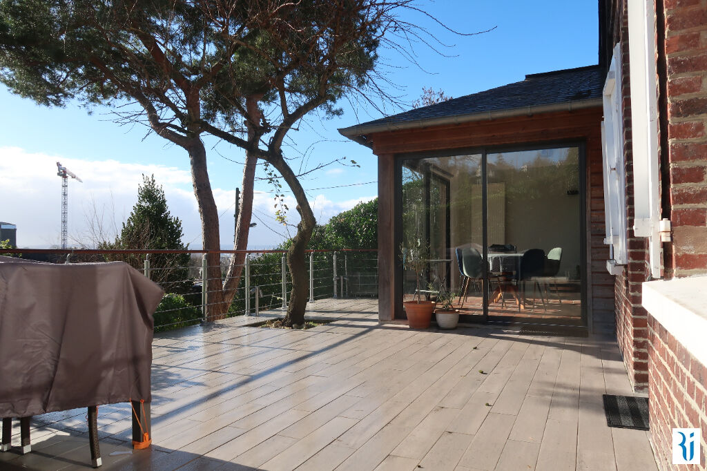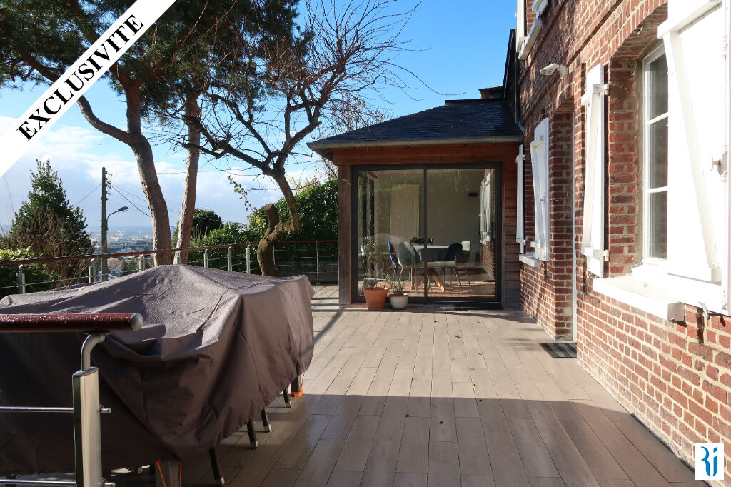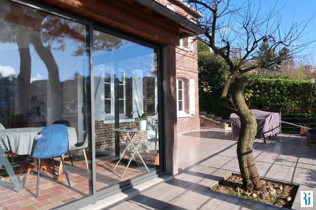 NOUVEAUTÉ, proposée en EXCLUSIVITÉ par le cabinet. BOIS GUILLAUME, Mont Fortin. Dans un très bel environnement calme avec vue dégagée et seulement 1 km de la gare de Rouen, très jolie maison de charme de 102 m2 avec extension contemporaine. Celle ci vous séduira par le caractère de l'ancien et le confort du moderne. rdc: salon parqueté et salle à manger donnant directement sur très grande terrasse, cuisine équipée, arrière cuisine,wc. 1 er étage: palier, 3 chambres, sdb, sdd avec wc. jardin sur 3 niveaux de 332 m2. Maison coup de coeur rare à la vente.