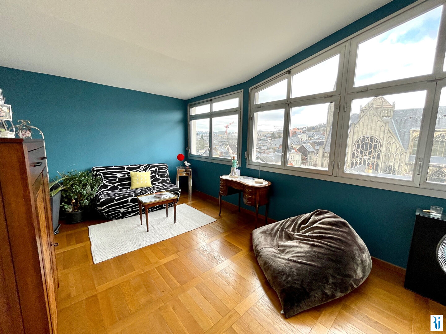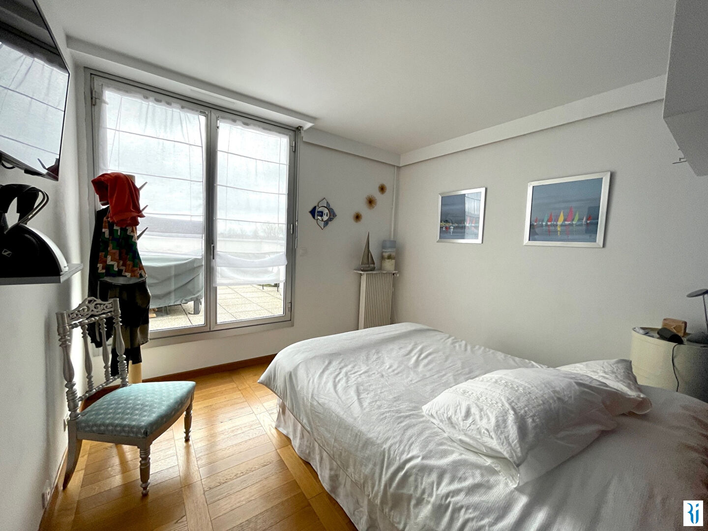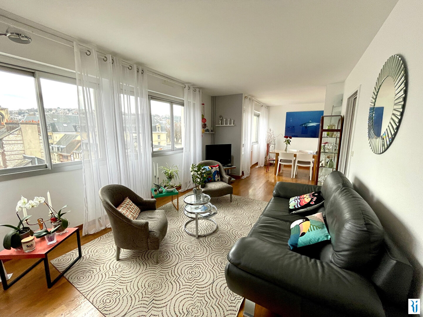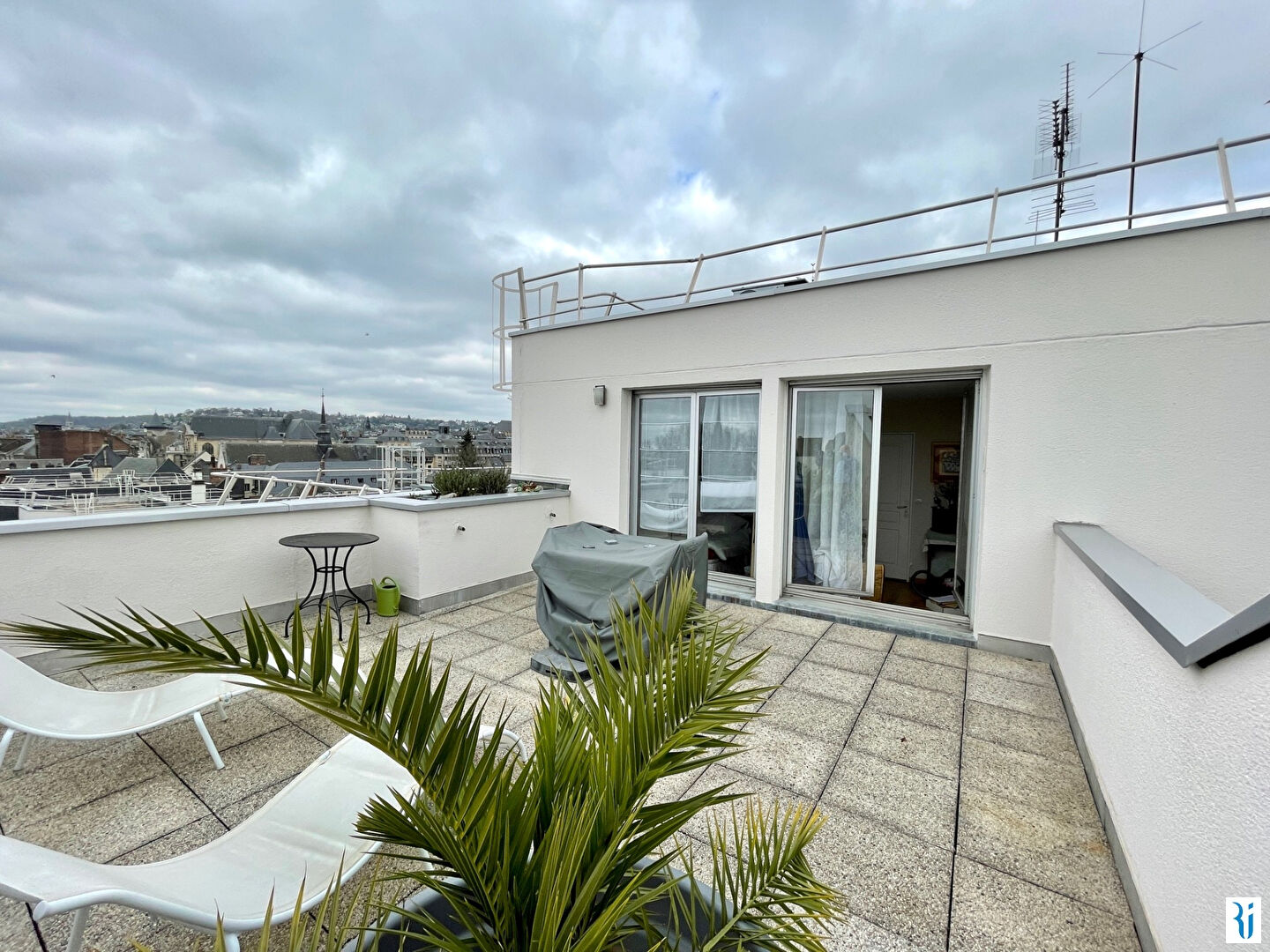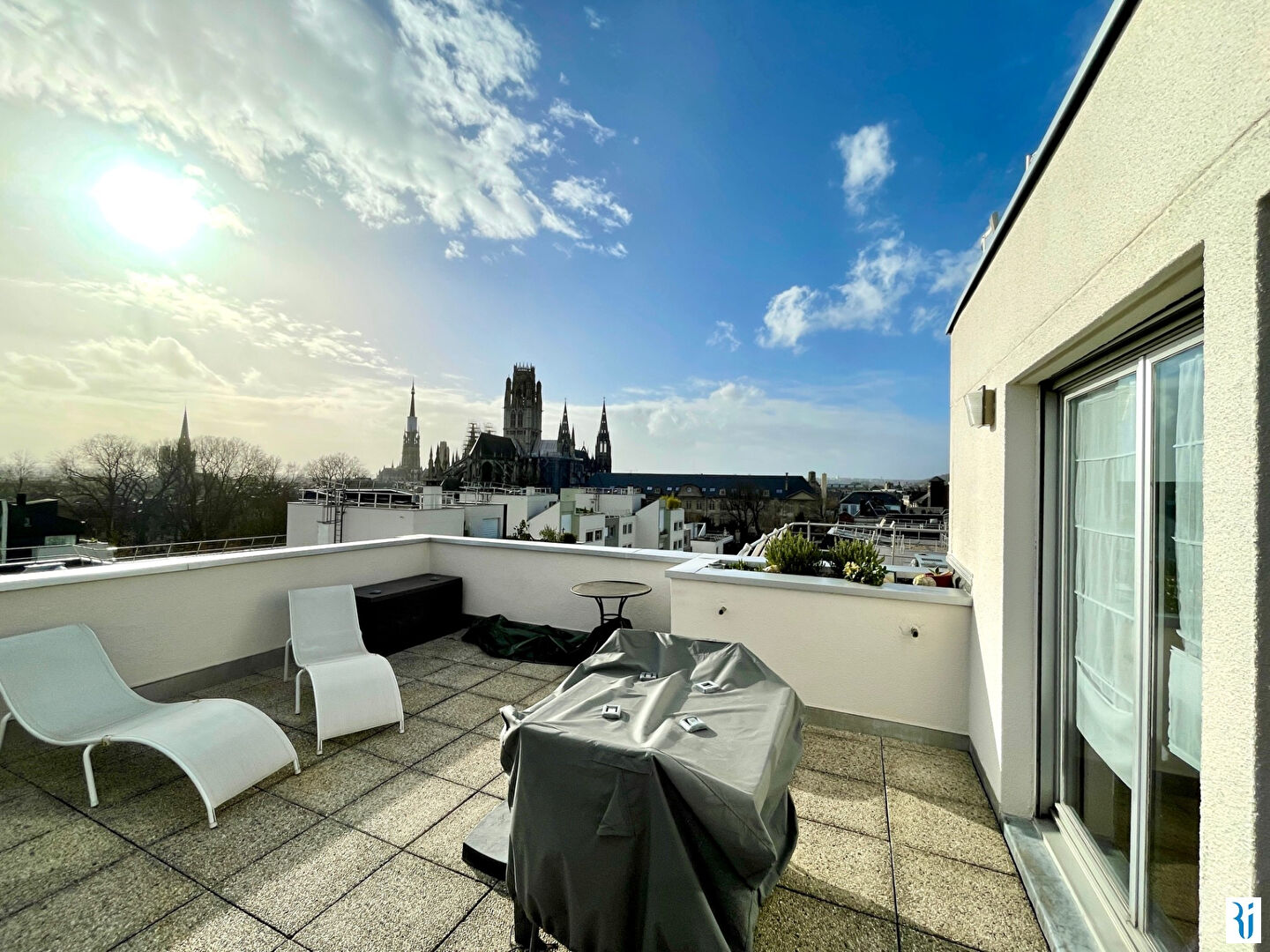 ROUEN CENTRE Mairie - EN EXCLUSIVITE - Appartement au dernier étage avec ASCENSEUR d'une surface de106m² + 28m² de TERRASE exposée sud avec vue dégagée comprenant: entrée, salon et salle à manger, cuisine aménagée; En duplex 3 chambres dont une avec salle de bains privative, salle de douche, dressing - accès à la terrasse - cave - PARKING COUVERT pour 2 voitures - chauffage, eaux, gardien compris dans les charges - produit rare.... (4.86 % honoraires TTC à la charge de l'acquéreur.) Copropriété de 337 lots (). Charges annuelles : 3180 euros.